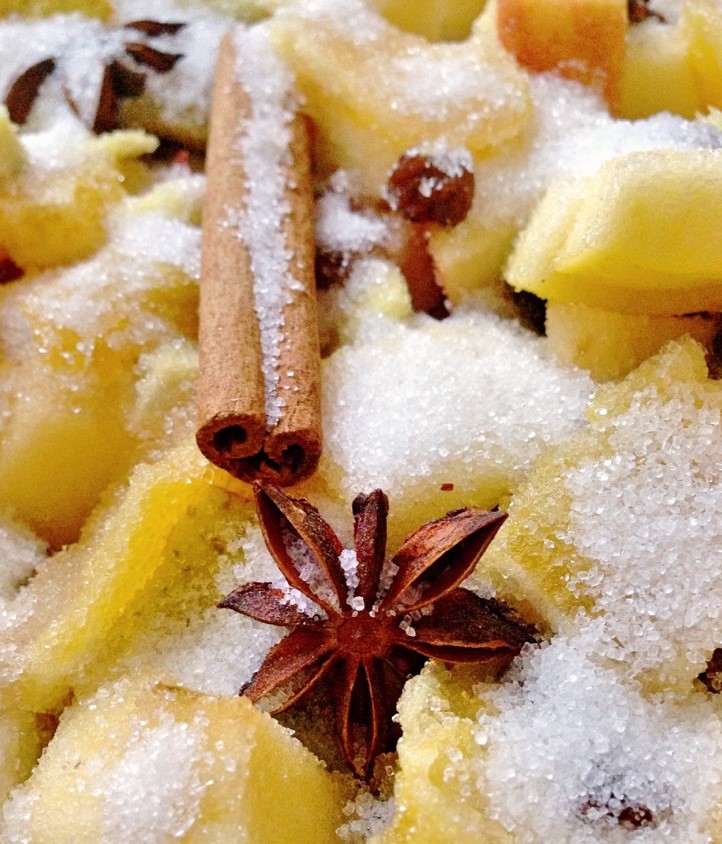 - Očištěná jablka nakrájíme na větší kousky a dáme na plech. Přidáme oloupaný citron, koření a cukr podle chuti. Rozinky necháme spařit, přidáme ke zbytu a smícháme. Do předehřáté trouby na 185 stupňů vložíme plech a během pečení občas promícháme. Pečeme zhruba 40 minut a pár minut před koncem můžeme přilít rum.